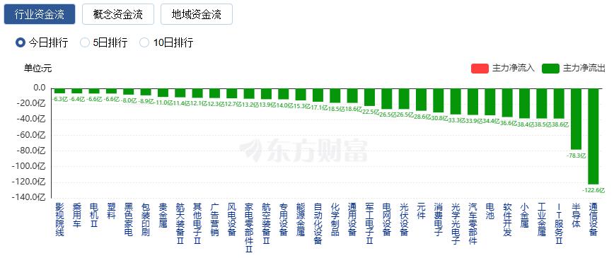 净流出方面,通信设备、半导体、IT服务等净流出排名靠前,其中通信设备净流出122.60亿元。